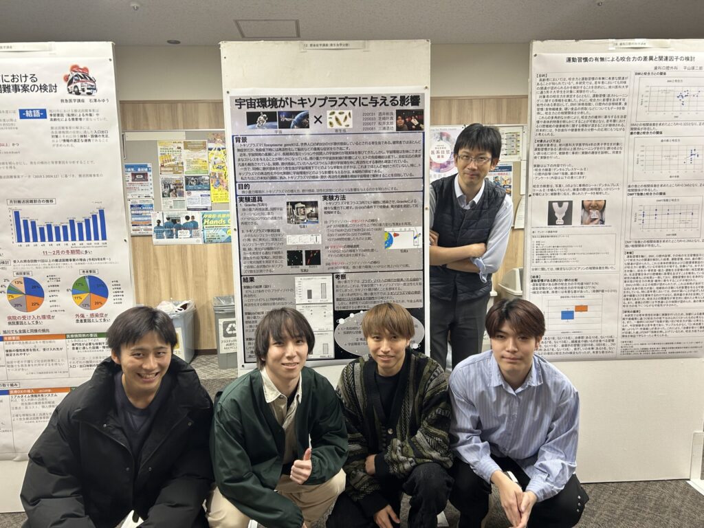 医学科4年生の三浦丞功さん、芝﨑叶真さん、酒井彬良さん、松井太郎さんが、令和7年度医学研究特論発表会において「宇宙環境が寄生虫トキソプラズマに与える影響」に関する研究について、口頭発表およびポスター発表を行いました。